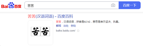 在對商標進行含義解釋時,萬不可將其割裂開來,進行個字認讀,應(yīng)以商標整體構(gòu)成要素進行統(tǒng)一認讀。申請商標“苦苦”為統(tǒng)一而不可分割的整體,系固有詞匯,具有固定的含義指向。常見于相關(guān)公眾的口語表述中,如辛辛苦苦、苦苦哀求等詞語,具有堅決、執(zhí)著、懇切等含義。