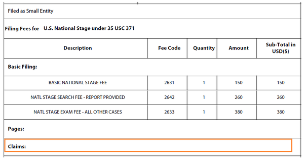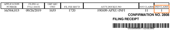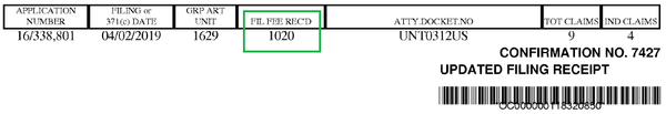 在USPTO發(fā)出的受理通知書上,可以看到官方認(rèn)定的獨立權(quán)利要求數(shù)為4,同時顯示官方收到的申請人費用(綠色方框),參見下圖: