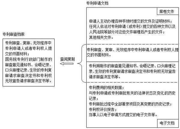 專利審查檔案,包括專利審查、復(fù)審、無(wú)效程序中專利申請(qǐng)人或者專利權(quán)人提交的書(shū)面材料,國(guó)務(wù)院專利行政部門制作的審查意見(jiàn)通知書(shū)、會(huì)晤記錄、口頭審理記錄、生效的專利復(fù)審請(qǐng)求審查決定書(shū)和專利權(quán)無(wú)效宣告請(qǐng)求審查決定書(shū)等。