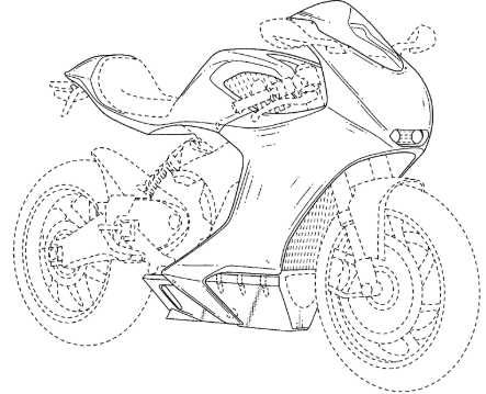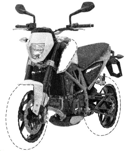 在線條圖中局部外觀設(shè)計以實線和虛線表示,比如下方圖1所示的摩托車,其保護范圍由實線決定,虛線表示不保護的部分。虛線的線寬需小于實線的線寬。