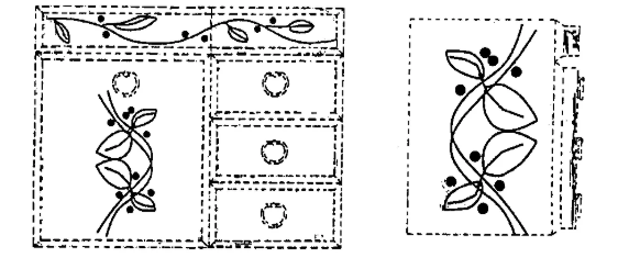 而如果一件外觀設(shè)計的保護客體僅在于表面圖案,那么其必須以產(chǎn)品為載體,這也相當(dāng)于一種局部外觀設(shè)計了。這種情況下也是用虛線來表示產(chǎn)品的輪廓,下方圖4是Design Patent Application Guide中的示例,所保護的是珠寶盒上的表面圖案。