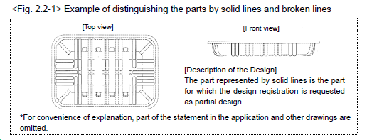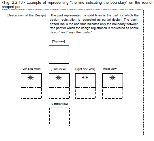 為了表達要求保護的局部外觀設(shè)計,可以借助于虛線和實線,或者可以使用不同的色塊,或者用點劃線來表示分界線。此外,日本還規(guī)定在外觀設(shè)計說明中通過文字明確請求保護的部分,比如指出實線所示的部分是請求保護的局部外觀設(shè)計,或色塊之外的其他部分是請求保護的局部外觀設(shè)計。
