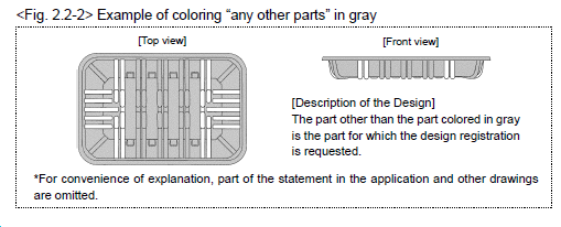 當(dāng)通過著色來區(qū)分保護部分和不保護部分時,同時在外觀設(shè)計說明中應(yīng)指出“除著色部分(如除灰色部分)以外的任何部分”是作為部分外觀設(shè)計請求進行保護的部分,如下圖10所示??梢钥闯?,這一點跟歐美的涂覆或者淡化處理是有所區(qū)別的,日本允許用不同的顏色加上語言說明來進行區(qū)分。
