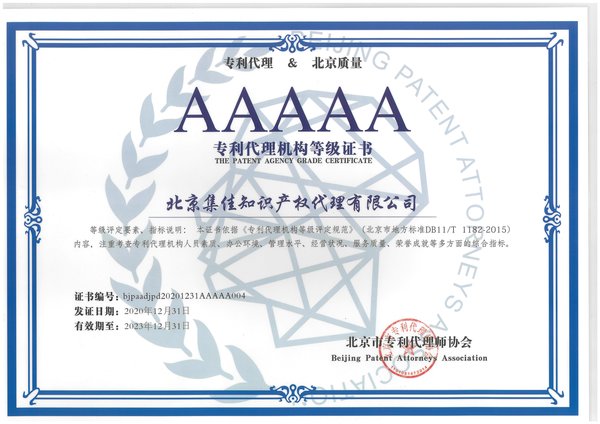 2021年6月4日,北京市知識(shí)產(chǎn)權(quán)局、北京市專利代理師協(xié)會(huì)在京舉辦2020年專利代理機(jī)構(gòu)等級(jí)評(píng)定頒獎(jiǎng)儀式,北京集佳知識(shí)產(chǎn)權(quán)代理有限公司憑借穩(wěn)健的綜合實(shí)力獲得各界肯定,經(jīng)過層層選拔、多維考核,最終再次獲評(píng)最高等級(jí)——北京市“AAAAA專利代理機(jī)構(gòu)”,集佳合伙人王學(xué)強(qiáng)代表集佳領(lǐng)取獎(jiǎng)牌和證書。