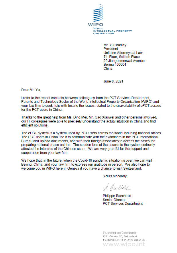 近日,世界知識產權組織(WIPO)國際局PCT服務部高級司長Philippe Baechtold向集佳合伙人會議主席于澤輝所長發(fā)來感謝信,對協(xié)助PCT服務部完美解決了WIPO ePCT系統(tǒng)在中國使用問題的集佳工作人員表示衷心感謝!