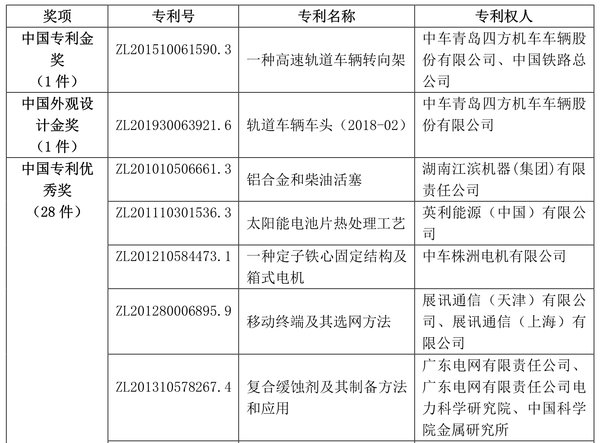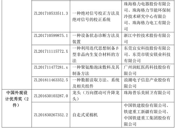 6月25日,國家知識產(chǎn)權(quán)局發(fā)布了第二十二屆中國專利獎授獎決定,為30項發(fā)明、實用新型專利授予中國專利金獎,10項外觀設(shè)計專利授予中國外觀設(shè)計金獎,60項發(fā)明、實用新型專利中國專利銀獎,15項外觀設(shè)計專利中國外觀設(shè)計銀獎,825項發(fā)明、實用新型專利中國專利優(yōu)秀獎,56項外觀設(shè)計專利中國外觀設(shè)計優(yōu)秀獎。