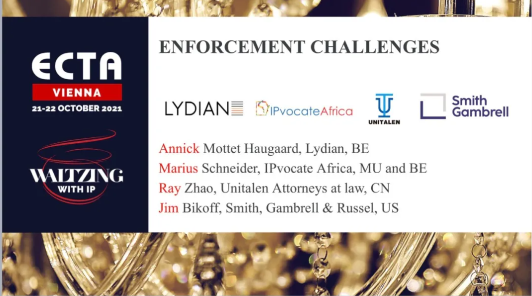 歐洲商標(biāo)協(xié)會(huì)(ECTA)第39屆年會(huì)“與IP共舞”將于2021年10月21-22日在維也納舉行。為了重現(xiàn)ECTA年會(huì)的啟動(dòng)慣例,10月13日,ECTA在線舉行了年會(huì)例行的“周三研討會(huì)”——“商標(biāo)保護(hù)挑戰(zhàn)研討會(huì)”與“WIPO-EUIPO研討會(huì)”,這也是年會(huì)“重要會(huì)議包”內(nèi)容之一。集佳合伙人趙雷律師應(yīng)邀參加商標(biāo)權(quán)保護(hù)挑戰(zhàn)的主題討論,與來自比利時(shí)的前ECTA主席、Lydian事務(wù)所的高級(jí)合伙人Annick,美國Smith, Gambrell & Russel事務(wù)所的高級(jí)合伙人Jim,以及毛里求斯IPvocate事務(wù)所的Marius等行業(yè)專家共同探討商標(biāo)權(quán)人在全球各地商標(biāo)權(quán)保護(hù)的挑戰(zhàn)與對(duì)策。