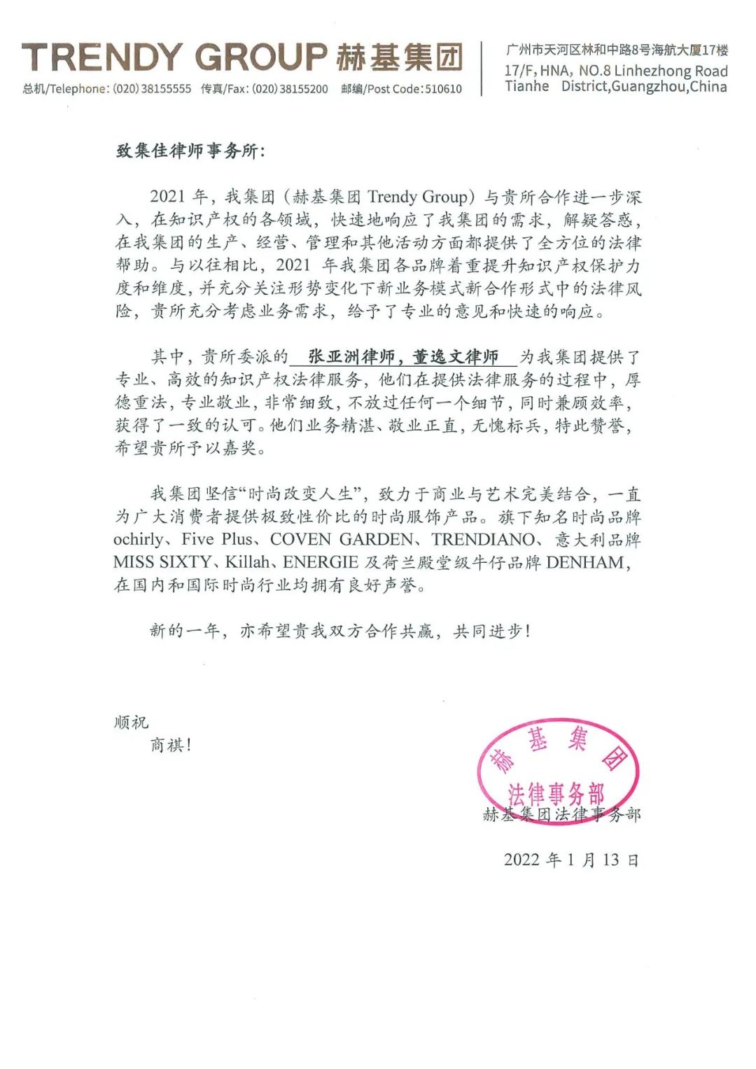 新春佳節(jié)將至,集佳收到赫基集團(tuán)發(fā)來(lái)的表?yè)P(yáng)信,贊譽(yù)集佳律師事務(wù)所張亞洲律師和董逸文律師專(zhuān)業(yè)、高效的知識(shí)產(chǎn)權(quán)法律服務(wù)。