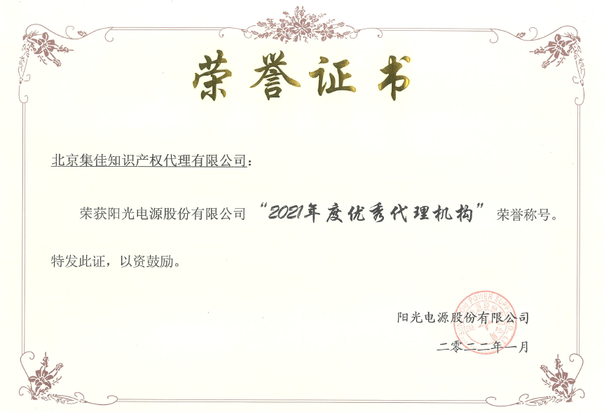 新春伊始,集佳服務(wù)再次喜獲客戶點贊——陽光電源股份有限公司授予集佳“2021年度優(yōu)秀代理機構(gòu)”榮譽稱號,并授予集佳專利代理師安淼、胡素莉“2021年度金牌代理師”稱號,陳穎“2021年度新星代理師”稱號。