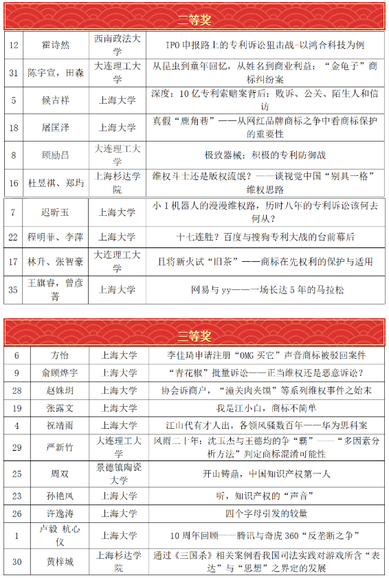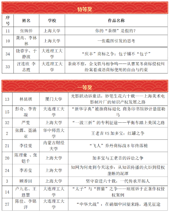 由集佳律所上海分所贊助、上海大學(xué)法學(xué)院/知識(shí)產(chǎn)權(quán)學(xué)院主辦的首屆“知識(shí)產(chǎn)權(quán)?中國(guó)故事”撰寫(xiě)比賽,經(jīng)過(guò)參賽作品展示、入圍初選、專家評(píng)審以及決賽答辯等環(huán)節(jié)的激烈角逐,于2022年3月26日在上海大學(xué)圓滿落下帷幕,來(lái)自上海大學(xué)、大連理工大學(xué)、西南政法大學(xué)、上海杉達(dá)學(xué)院、廈門大學(xué)、內(nèi)蒙古財(cái)經(jīng)大學(xué)、景德鎮(zhèn)陶瓷大學(xué)和華中師范大學(xué)的35組本科生及研究生摘奪了35個(gè)專業(yè)獎(jiǎng)項(xiàng)。