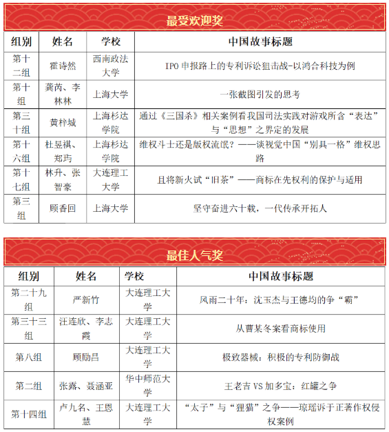 接下來(lái)就是最讓人激動(dòng)的的頒獎(jiǎng)環(huán)節(jié)了,頒獎(jiǎng)嘉賓徐上、李文紅、袁真富、于偉、王勉青老師分別為獲得特等獎(jiǎng)、一等獎(jiǎng)、二等獎(jiǎng)、三等獎(jiǎng),以及最受歡迎獎(jiǎng)、最佳人氣獎(jiǎng)的同學(xué)頒獎(jiǎng)。研究生獲獎(jiǎng)代表張婉僑同學(xué)和本科生獲獎(jiǎng)代表汪連欣同學(xué)發(fā)表獲獎(jiǎng)感言,感謝集佳上海分所提供支持,感謝本次比賽提供寶貴的學(xué)習(xí)機(jī)會(huì),并祝愿比賽越辦越好。