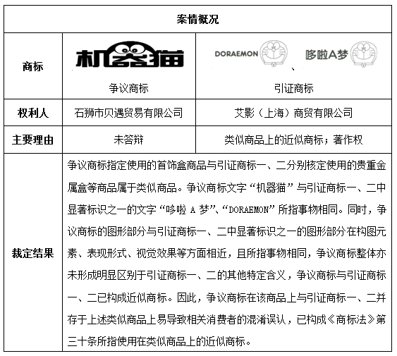 從《哆啦A夢》的中文譯名的發(fā)展歷程中可知,“機器貓”與“哆啦A夢”、“DORAEMON”指的是同一事物。而本案被申請人石獅市貝遇貿(mào)易有限公司必然是能夠知曉“機器貓”與“哆啦A夢DORAEMON”均指的是《哆啦A夢》這一動漫作品,其申請注冊“機器貓”商標必然是具有不正當目的。