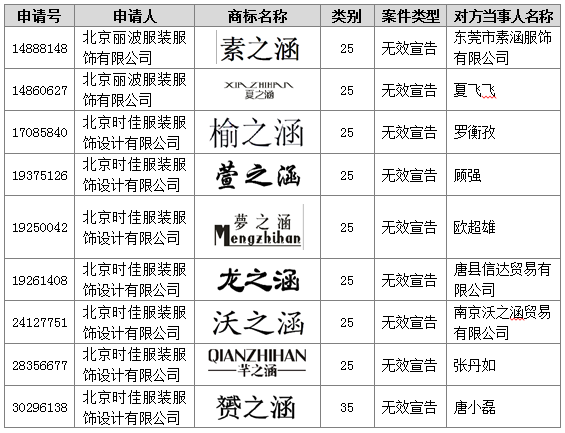 “之涵”為北京時(shí)佳服裝服飾設(shè)計(jì)有限公司所獨(dú)創(chuàng)的品牌,其使用在“服裝”等商品上,該品牌早在2014年1月28日即申請(qǐng)注冊(cè)為商標(biāo),并且于2015年3月14日獲得注冊(cè)。并且,經(jīng)過(guò)時(shí)佳公司的大量使用,該品牌已經(jīng)獲得了一定的知名度。尤其是,時(shí)佳公司極為注重品牌的保護(hù),針對(duì)包含“之涵”的商標(biāo)積極地提出異議或者無(wú)效宣告。在大量的無(wú)效宣告裁定中,國(guó)家知識(shí)產(chǎn)權(quán)局均判定“之涵X”或者“X之涵”的商標(biāo)與時(shí)佳公司的“之涵”引證商標(biāo)近似。在先案例部分列舉如下: