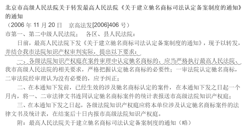 北京高院2006年發(fā)布的《關(guān)于轉(zhuǎn)發(fā)最高人民法院《關(guān)于建立馳名商標司法認定備案制度的通知》》進一步表明:由中級法院認定的馳名商標,應(yīng)該報所在地的高級法院審核,審核內(nèi)容包括擬認定馳名商標是否滿足了認定的必要性及認定的可能性。