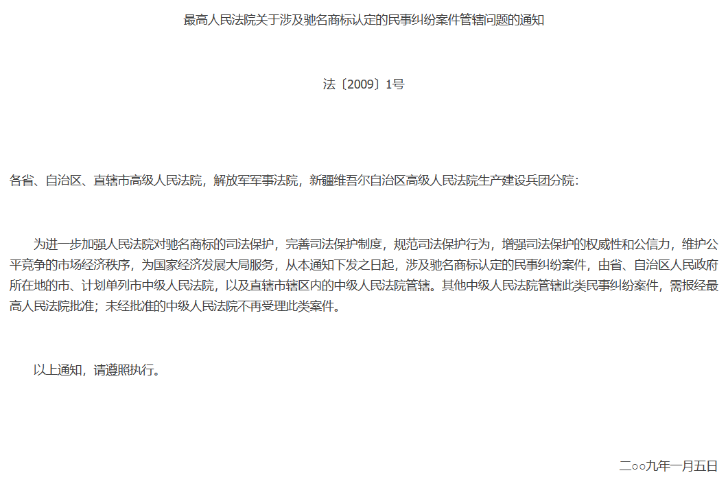 以下是與馳名商標案件管轄有關(guān)的文件,該通知發(fā)布后各個地區(qū)馳名商標案件管轄進一步的集中化,馳名商標案件的管轄集中程度可以與發(fā)明專利侵權(quán)案件管轄集中程度相媲美。