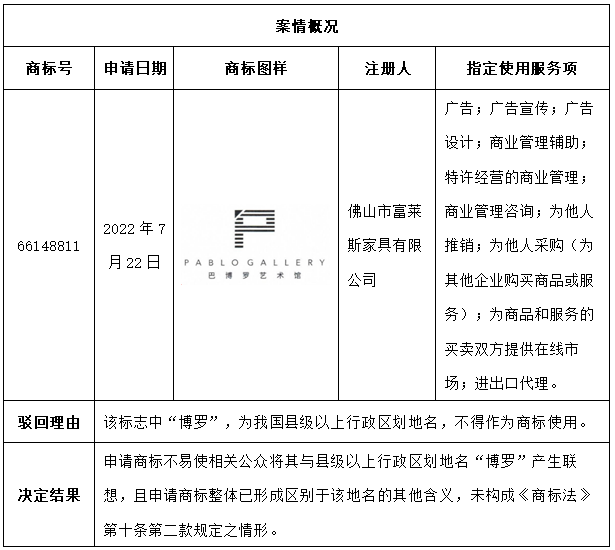 首先,“巴博羅”是佛山市富萊斯家具有限公司旗下的家具品牌,查閱佛山市富萊斯家具有限公司旗下的商標(biāo)注冊(cè)情況可知,其最早于2011年就提交了“巴博羅 PABLO CASA”商標(biāo)注冊(cè)申請(qǐng),隨后又申請(qǐng)注冊(cè)了多件“巴博羅 PABLO CASA”商標(biāo),能夠證明佛山市富萊斯家具有限公司使用“巴博羅 PABLO CASA”商標(biāo)已經(jīng)達(dá)十幾年之久。本案中申請(qǐng)商標(biāo)漢字為“巴博羅藝術(shù)館”,其屬于在“巴博羅”基礎(chǔ)上延伸的品牌,消費(fèi)者基于對(duì)“巴博羅”品牌的認(rèn)知,也會(huì)將“巴博羅藝術(shù)館”視為是“巴博羅”的系列商標(biāo)。雖然“博羅”是隸屬于廣東省惠州市轄區(qū)下的一個(gè)縣級(jí)城市名稱(chēng),但其作為縣級(jí)城市名稱(chēng)并不被廣大消費(fèi)者所熟知,當(dāng)普通消費(fèi)者看到“博羅”二字時(shí),并不太可能將其誤認(rèn)是行政區(qū)劃名稱(chēng)。可見(jiàn),“博羅”與“巴博羅藝術(shù)館”是能夠被區(qū)分開(kāi)來(lái),消費(fèi)者不會(huì)將二者混同。