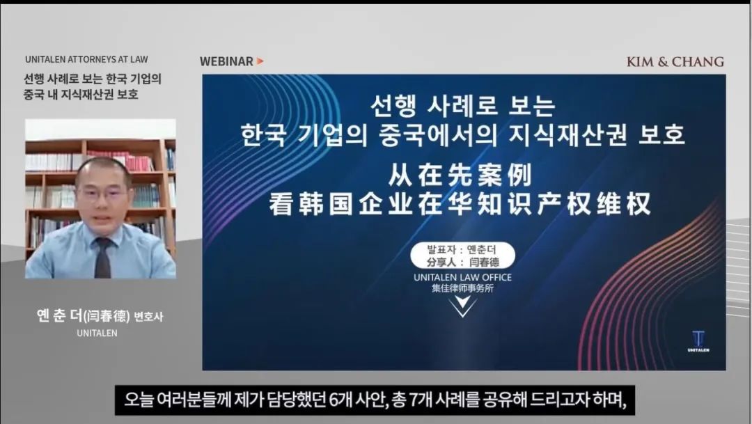 應(yīng)韓國(guó)金張律師事務(wù)所邀請(qǐng),2022年11月25日,集佳合伙人閆春德律師通過(guò)網(wǎng)絡(luò)研討會(huì)形式,為韓國(guó)企業(yè)作“韓企在華知識(shí)產(chǎn)權(quán)維權(quán)”專題講座。合伙人鄭毅律師全程參與本次講座與韓方的溝通與組織協(xié)調(diào)工作。