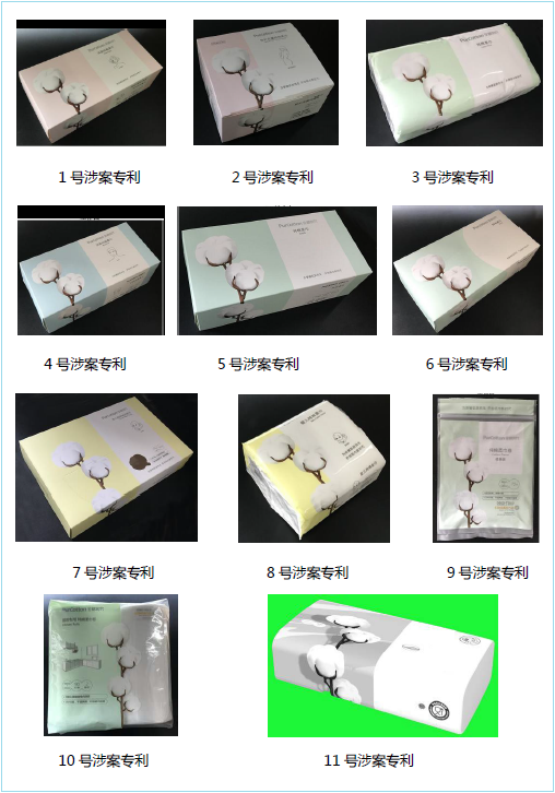 涉案專利均為棉柔巾產品的外包裝盒及外包裝袋,具有相似的設計元素和設計風格。其中,10件專利的申請日為2017年6月5日,1件專利的申請日為2019年1月10日,所有專利均未對外觀設計的顏色予以保護。