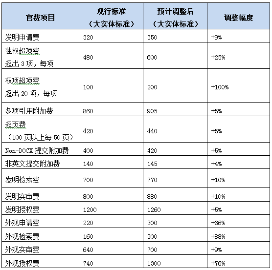 本次計劃調(diào)整專利官費(fèi)普遍上調(diào)5%以上,部分上調(diào)70%-100%,另外還增加了一些新的官費(fèi)項目,主要調(diào)整內(nèi)容如下: