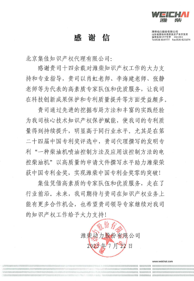 近日,集佳收到客戶濰柴動力股份有限公司的感謝信,感謝集佳為濰柴動力撰寫的發(fā)明專利“一種柴油機噴油控制方法及應(yīng)用該控制方法的電控柴油機”榮獲第二十四屆中國專利金獎,實現(xiàn)了濰柴中國專利金獎零的突破!