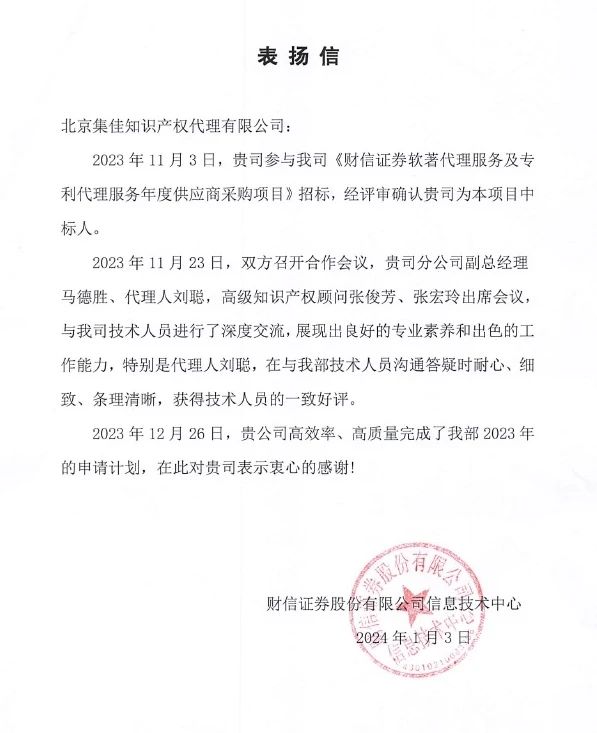 財信證券股份有限公司信息技術(shù)中心為集佳發(fā)來表揚信,贊揚集佳長沙分公司副總經(jīng)理馬德勝、代理人劉聰,高級知識產(chǎn)權(quán)顧問張俊芳、張宏玲等,在為客戶提供專利代理服務(wù)的過程中展現(xiàn)出良好的專業(yè)素養(yǎng)與出色的工作能力,高效率、高質(zhì)量地幫助客戶完成了2023年專利申請計劃。特別是代理人劉聰,在與客戶技術(shù)人員溝通答疑時耐心、細致、條理清晰,獲得了技術(shù)人員的一致好評。