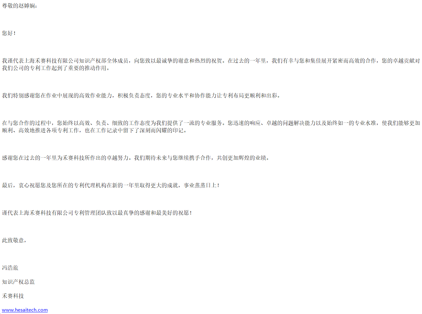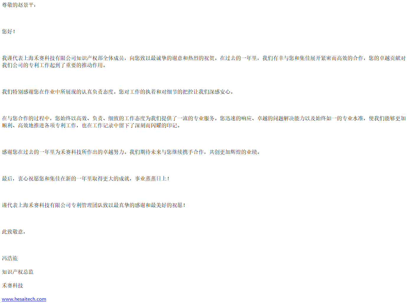 禾賽科技有限公司知識產(chǎn)權(quán)總監(jiān)馮浩旅致感謝信,稱贊上海分所代理人趙嫭嫻與趙景平以高效、負責(zé)、細致的工作態(tài)度為客戶提供了一流的專業(yè)服務(wù),在合作中展現(xiàn)了卓越的問題解決能力以及始終如一的專業(yè)水準(zhǔn),協(xié)助客戶順利、高效地推進各項專利工作。期待未來與集佳繼續(xù)攜手合作,共創(chuàng)更加輝煌的業(yè)績。