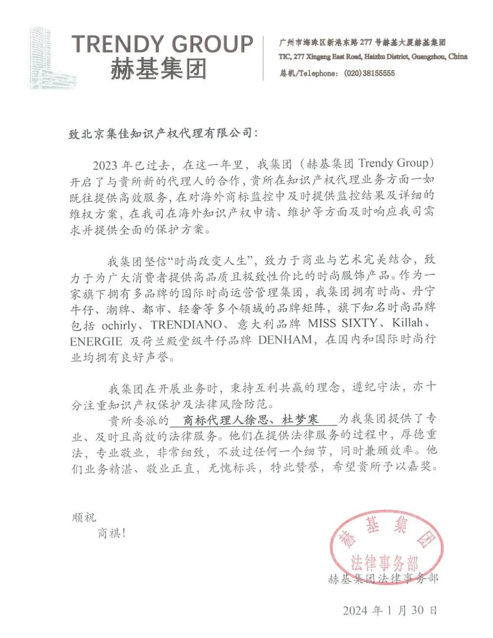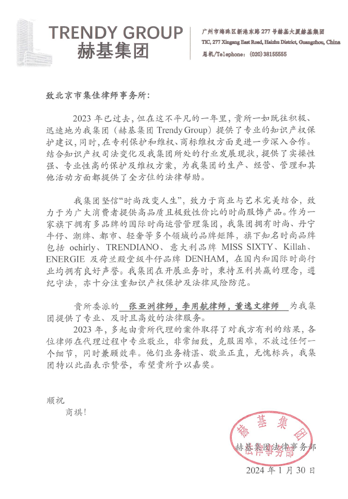 信中提到,2023年,集佳與赫基集團(tuán)在專利保護(hù)和維權(quán)、商標(biāo)維權(quán)方面更進(jìn)一步加強(qiáng)合作,集佳一如既往、迅速地為赫基集團(tuán)提供了專業(yè)的知識(shí)產(chǎn)權(quán)保護(hù)建議,集佳提供的實(shí)操性強(qiáng)、專業(yè)性高的保護(hù)及維權(quán)方案,為赫基集團(tuán)的生產(chǎn)、經(jīng)營(yíng)、管理和其他活動(dòng)方面都提供了全方位的法律幫助。赫基集團(tuán)法務(wù)部贊揚(yáng)集佳張亞洲律師、李用航律師、董逸文律師、徐思律師、商標(biāo)代理人杜夢(mèng)寒等,在提供專業(yè)、及時(shí)且高效的法律服務(wù)的過(guò)程中,厚德重法,業(yè)務(wù)精湛,敬業(yè)正直,無(wú)愧標(biāo)兵。