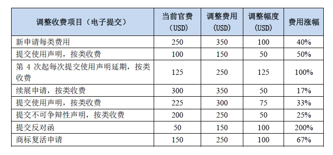 USPTO此次費(fèi)用調(diào)整計(jì)劃涉及31項(xiàng)商標(biāo)相關(guān)官費(fèi),包括多項(xiàng)費(fèi)用上漲及新增收費(fèi)項(xiàng)目,其中重要調(diào)整如下所示,主要涉及商標(biāo)申請(qǐng)、提交使用聲明申請(qǐng)和延期申請(qǐng)、非規(guī)范商品費(fèi)用以及信息缺失的補(bǔ)正費(fèi)用。同時(shí),USPTO本次將馬德里指定美國(guó)商標(biāo)((66)a申請(qǐng))的官費(fèi)調(diào)整為與單一申請(qǐng)官費(fèi)一致,并以瑞士法郎形式在馬德里國(guó)際局收取。