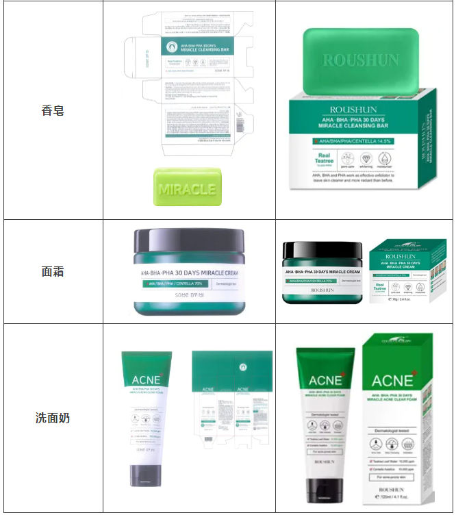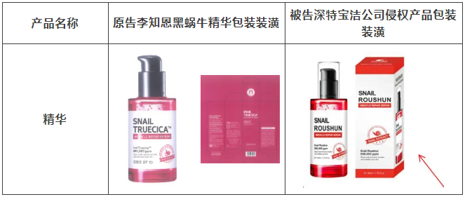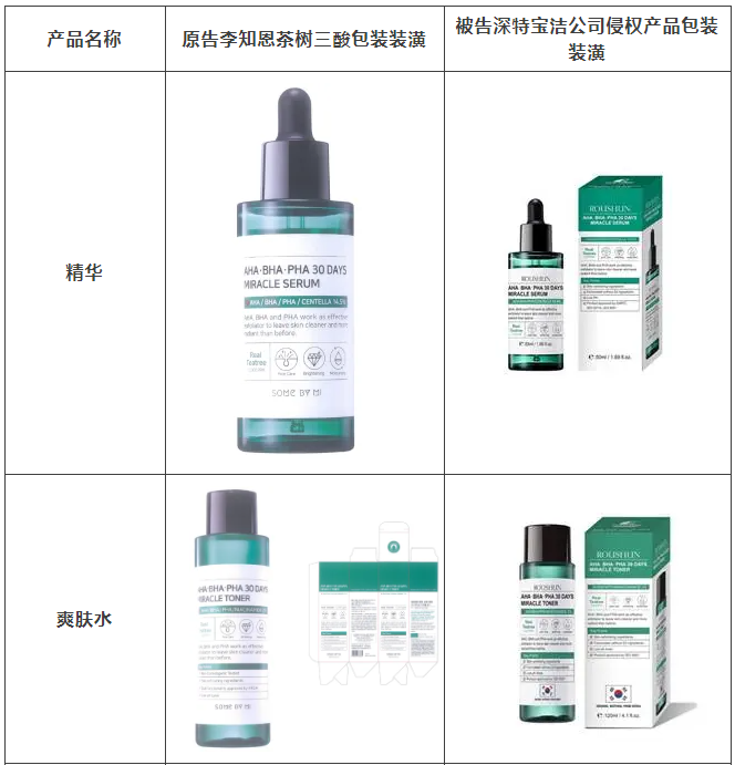2021年原告委托北京市集佳律師事務(wù)所調(diào)查發(fā)現(xiàn),被告汕頭市深特寶潔實(shí)業(yè)有限公司生產(chǎn)、銷售和推廣的“茶樹祛痘美白補(bǔ)水液”“茶樹香皂”等護(hù)膚品,其產(chǎn)品包裝裝潢直接抄襲、摹仿原告前述已經(jīng)具有較高知名度和影響力的“SOME BY MI/莎柏蜜”茶樹三酸系列化妝品和黑蝸牛精華液的包裝、裝潢設(shè)計(jì),使用與之近似的標(biāo)識(shí),造成消費(fèi)者混淆誤認(rèn)。故原告作為茶樹三酸、黑蝸牛精華包裝裝潢權(quán)益獲益人,訴至廣東省汕頭市中級(jí)人民法院。汕頭中院認(rèn)定:李知恩主張的茶樹三酸、黑蝸牛精華包裝裝潢構(gòu)成具有一定影響的包裝裝潢,深特寶潔公司生產(chǎn)、銷售茶樹三酸、黑蝸牛精華液的行為構(gòu)成不正當(dāng)競爭。因判賠額不符合原告預(yù)期,原告后上訴至廣東省高級(jí)人民法院,廣東省高級(jí)人民法院最終維持一審判決。