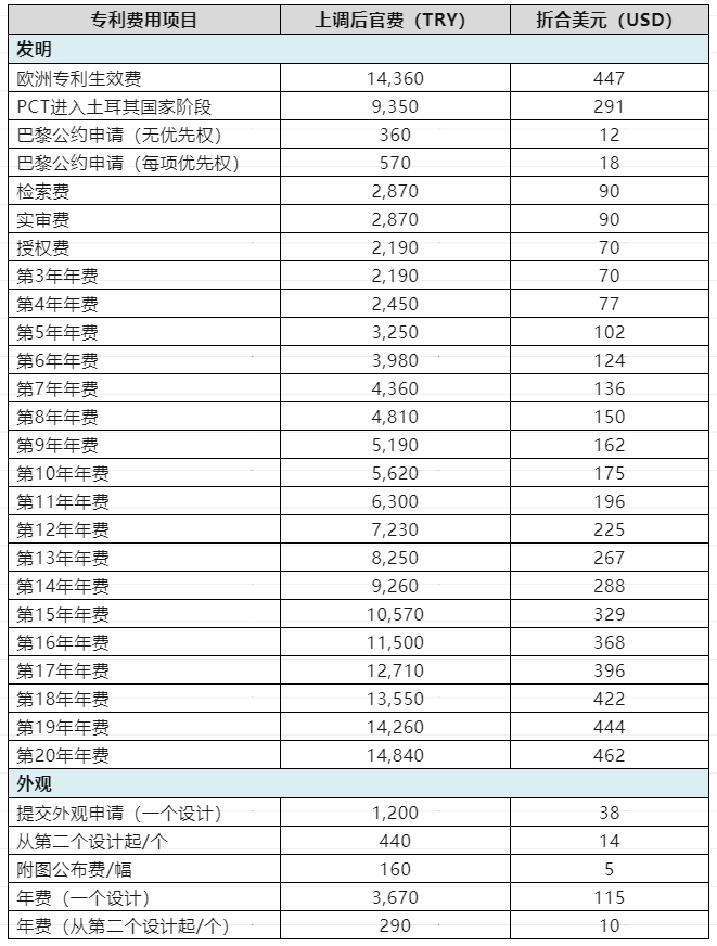 2024年4月24日,土耳其專(zhuān)利局公布了新的官費(fèi)標(biāo)準(zhǔn),本次調(diào)整是繼2024年1月后今年的第二次官費(fèi)調(diào)整,調(diào)整后官費(fèi)標(biāo)準(zhǔn)如下: