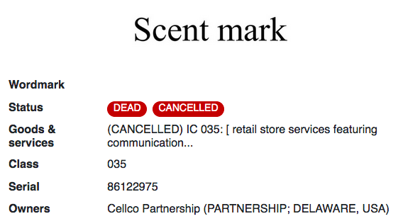 Verizon計(jì)劃將這種注冊(cè)商標(biāo)的香味推廣到其線下旗艦店。根據(jù)申請(qǐng)書的記載,此香味有助于將這些地點(diǎn)與“日益擁擠的其他通信和消費(fèi)電子產(chǎn)品零售商”區(qū)分開來。該氣味商標(biāo)于2014年10月7日成為正式獲準(zhǔn)注冊(cè),該商標(biāo)目前已經(jīng)失效。