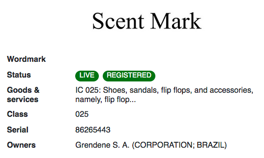 鞋類連鎖店 Flip Flop Shops 在線下店鋪中使用的椰子香味已獲得商標(biāo)注冊(cè)。注冊(cè)人申請(qǐng)時(shí)提交了大量新聞報(bào)道,聲稱這種香味是他們品牌的重要識(shí)別部分。其中一個(gè)例子寫道,“從 15 英尺外走近,椰子防曬油的香味和充滿能量的音樂開始刺激感官,讓潛在顧客興奮不已?!?/p>