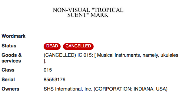 該公司將一種尤克里里琴型號(hào)所用的椰林飄香氣味成功申請(qǐng)為商標(biāo)。但在實(shí)際使用過程中卻面臨產(chǎn)品本身的問題。運(yùn)往海外的尤克里里琴在運(yùn)輸過程中失去了氣味……所以當(dāng)海外客戶彈奏時(shí),它們聞起來就只是尤克里里琴的味道了。目前該商標(biāo)注冊(cè)已失效。