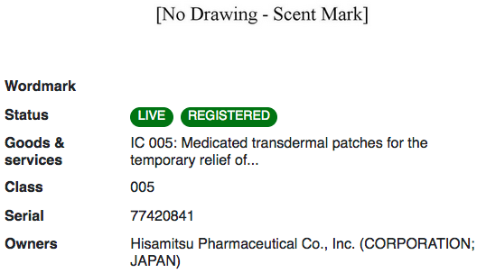 日本久光制藥株式會(huì)社為其止痛貼的“薄荷”香味注冊(cè)了商標(biāo),這種氣味是由“高濃度水楊酸甲酯(10wt%)和薄荷醇(3wt%)混合而成”的。