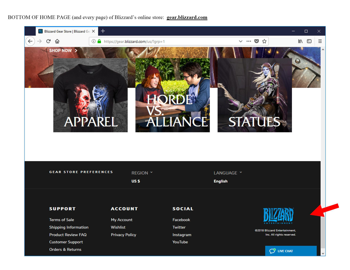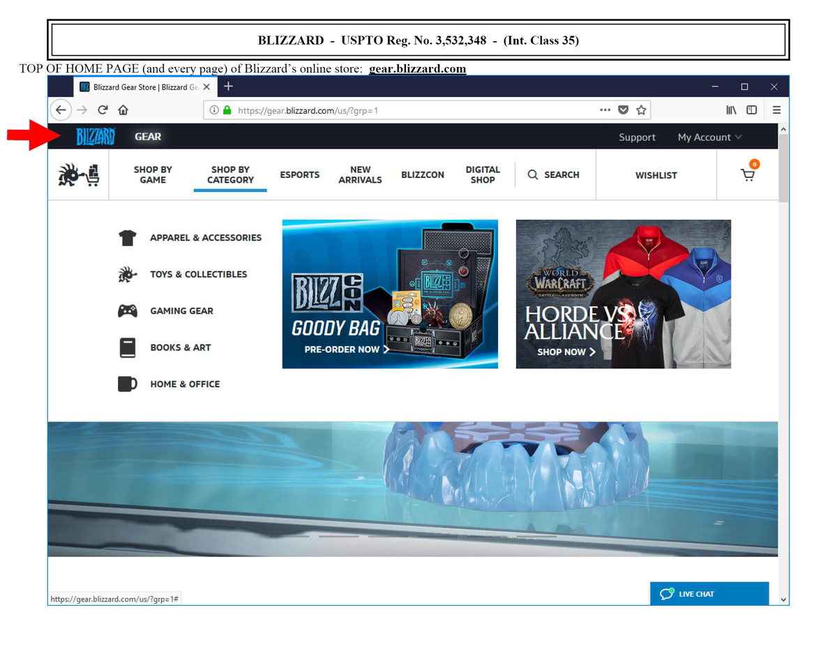 關(guān)于商標(biāo)申請(qǐng)人關(guān)注的自營(yíng)商店證據(jù)能否作為第35類使用證據(jù)被美國(guó)專利商標(biāo)局接受這一問題。前文提及Blizzard面對(duì)Ava Labs提出的反訴理由曾主張其提交的使用證據(jù)是否存在瑕疵是審查員和申請(qǐng)人之間的問題,言外之意即是強(qiáng)調(diào)其提交的使用證據(jù)已被美國(guó)專利商標(biāo)局審查員認(rèn)可為合格的第35類使用證據(jù)。當(dāng)前實(shí)踐中,審查員大部分情況下會(huì)接受申請(qǐng)人在自己官網(wǎng)使用申請(qǐng)商標(biāo)零售自己產(chǎn)品的證據(jù)。作為參考,以下為Blizzard于2018維護(hù)其商標(biāo)注冊(cè)時(shí)提交的第35類零售商店服務(wù)使用證據(jù),已被接受: