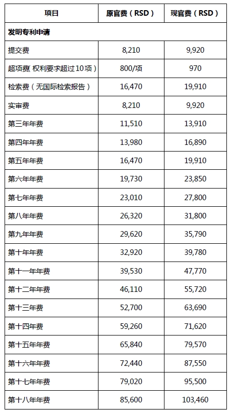 2024年8月1日起,塞爾維亞上調與知識產權相關的官費,上調幅度約為5%,與發(fā)明和實用新型專利申請相關的官費如下: