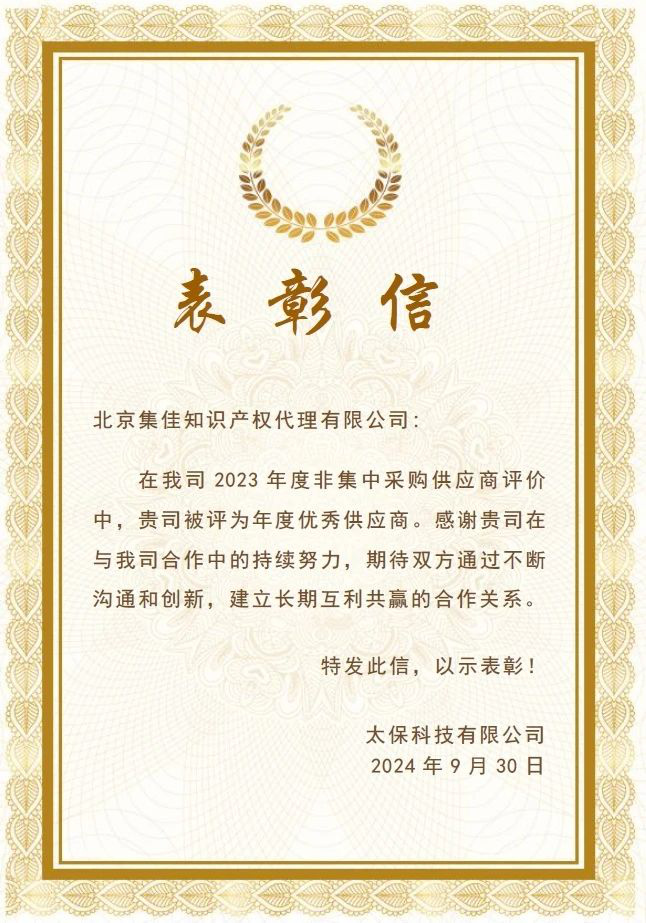 近日,集佳喜獲客戶太保科技有限公司的表彰信,授予集佳“年度優(yōu)秀供應(yīng)商”榮譽(yù)稱號(hào),感謝集佳在與太??萍己献髦械某掷m(xù)努力,并期待雙方通過不斷溝通和創(chuàng)新,建立長期互利共贏的合作關(guān)系。