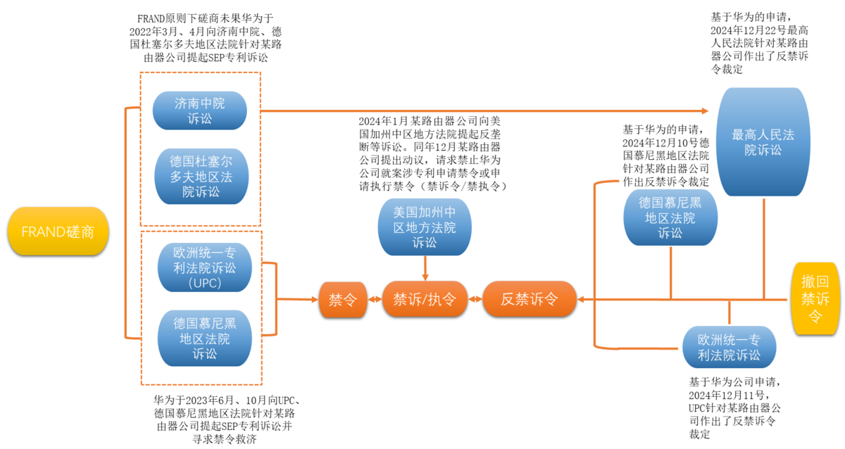 自2020年7月以來,華為公司基于FRAND原則表達了愿意與某路由器公司進行磋商就案涉專利在內(nèi)的涉及Wi-Fi SEP專利達成許可并提供了許可費率,但某路由器公司未給予積極回應(yīng),最終雙方磋商陷入僵局。后,華為公司自2022年7月開始的兩年間針對某路由器公司分別向我國濟南中院、德國杜塞爾多夫地區(qū)法院、德國慕尼黑地區(qū)法院以及歐洲統(tǒng)一專利法院(UPC)分別提起專利侵權(quán)訴訟。2024年1月某路由器公司在美國加州中區(qū)地方法院針對華為公司提起反壟斷訴訟,訴稱華為公司涉嫌違反美國《謝爾曼法》,企圖非法壟斷Wi-Fi技術(shù)市場;且某路由器公司向華為公司表示其準備進一步向美國法院提起費率訴訟,請求裁決華為公司持有的Wi-Fi SEP專利的全球許可費率。