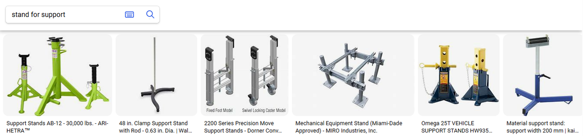 使用圖片搜索以模擬閱讀者對(duì)術(shù)語的理解,十分適用于機(jī)械領(lǐng)域的術(shù)語辨析,尤其是針對(duì)家電等生活化的領(lǐng)域。比如,“bracket”和“stand”是“支架”的兩種翻譯,通過圖片搜索,可以清晰看到其差別,即“bracket”多指安裝在墻上的支架,而“stand”多指立式支架,如圖2所示。