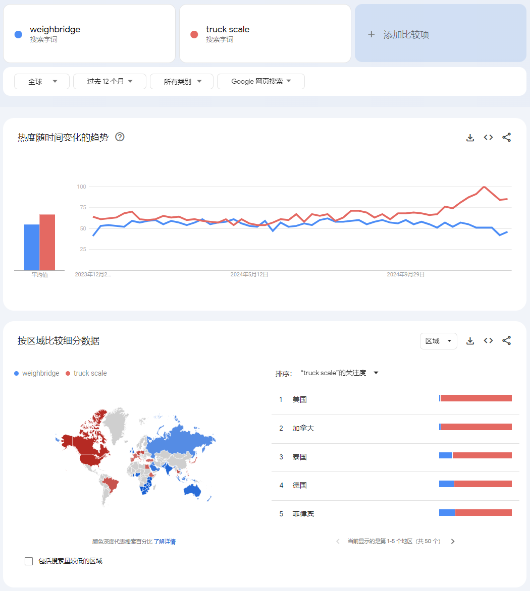 谷歌趨勢(shì)呈現(xiàn)了詞語被全球用戶搜索的頻率。通過谷歌趨勢(shì),我們可以對(duì)比一個(gè)術(shù)語的多種翻譯的常見程度,以及在不同國(guó)家的偏好。尤其是對(duì)于名詞短語,通過比較不同搭配的常見程度,可以確定它們的自然程度。如圖3所示,對(duì)于“地磅”這個(gè)術(shù)語,北美和歐陸地區(qū)傾向于使用“truck scale”,而英國(guó)、印度、澳大利亞等傾向于使用“weighbridge”,兩者總體的使用頻率卻差別不大,因此可以根據(jù)申請(qǐng)進(jìn)入的國(guó)家選擇最合適的譯文,有利于為客戶提供更精細(xì)化的服務(wù)。在另一些應(yīng)用中,使用頻率偏小的譯法可能意味著不夠地道,因此為術(shù)語翻譯提供了參考。