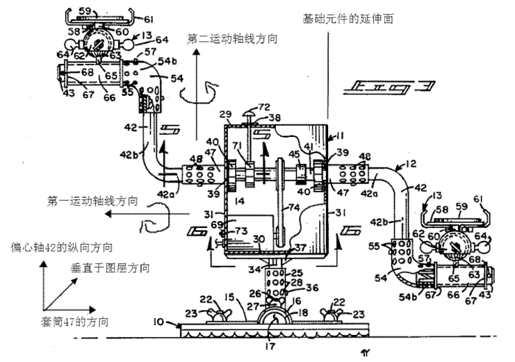 對比文件4僅僅公開了曲柄的轉(zhuǎn)動平面能夠圍繞通過銷57所限定的水平軸線來調(diào)整。然而,對比文件4中的曲柄不能夠被等同為案例中的“運動元件(17,18)”因為曲柄并非安裝在底板94上而是安裝在殼體90上。