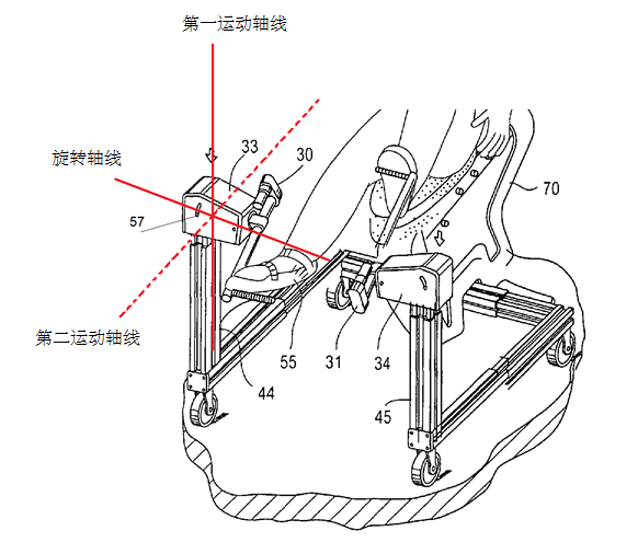 從對比文件4的圖5A中可見,審查員認(rèn)為對比文件4中的沿著豎直方向的軸線等同于案例的權(quán)利要求1中的“第一運動軸線”,踏板55圍繞其轉(zhuǎn)動的轉(zhuǎn)動軸線等同于案例的權(quán)利要求1中的旋轉(zhuǎn)軸線,因此,通過銷57限定的軸線(以紅色虛線在圖5A中示出)等同于案例的權(quán)利要求1中的第二運動軸線。
