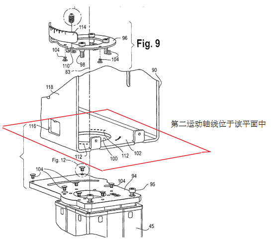 從對比文件4的圖9中可以看到,第二運動軸線位于紅色線框所示出的平面中。然而,螺釘98的肩部接合開口100的邊緣以將殼體90定位在該平面中。顯然,殼體90根本不可能圍繞該平面中的任何軸線轉(zhuǎn)動。也就是說,對比文件4并沒有公開案例的權(quán)利要求1中的技術(shù)特征“運動元件(1,2)能夠相對于相應(yīng)的中間元件(17,18)彼此無關(guān)地圍繞第二運動軸線(11,12)運動”。