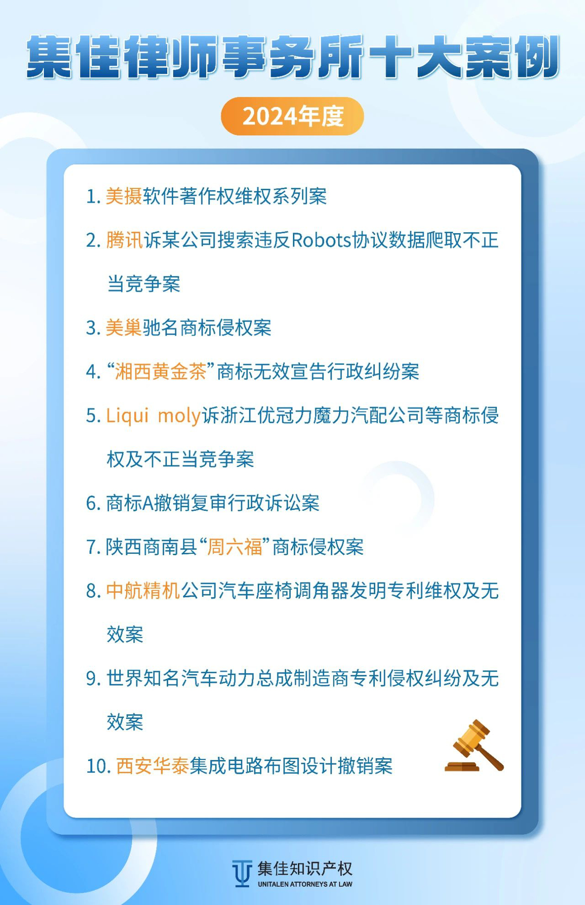 在世界知識產(chǎn)權(quán)日來臨之際,集佳律所從代理的眾多知識產(chǎn)權(quán)案件中篩選出2024年度具有代表性的十大案例,與各界同仁分享。這些案例具有較強的法律適用的典型意義和較大的社會影響,充分體現(xiàn)了國家知識產(chǎn)權(quán)保護的良好水平,體現(xiàn)了訴訟代理團隊的專業(yè)水準,同時也為與之類似案件提供了可資借鑒的維權(quán)范本。以下為2024年度北京市集佳律師事務(wù)所十大案例名錄: