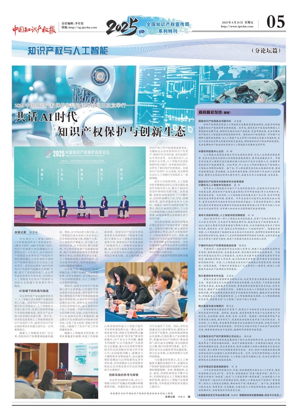 4月21-22日,由中國(guó)知識(shí)產(chǎn)權(quán)報(bào)社和世界知識(shí)產(chǎn)權(quán)組織(WIPO)中國(guó)辦事處聯(lián)合主辦的“2025中國(guó)知識(shí)產(chǎn)權(quán)保護(hù)高層論壇”在京成功舉辦。論壇以“機(jī)遇與挑戰(zhàn):人工智能背景下的知識(shí)產(chǎn)權(quán)治理”為主題,吸引了來(lái)自國(guó)家部委、高校和科研機(jī)構(gòu)、企業(yè)和知識(shí)產(chǎn)權(quán)服務(wù)機(jī)構(gòu)的代表參加。國(guó)家知識(shí)產(chǎn)權(quán)局局長(zhǎng)申長(zhǎng)雨、最高人民檢察院副檢察長(zhǎng)宮鳴、北京市副市長(zhǎng)孫碩,世界知識(shí)產(chǎn)權(quán)組織助理總干事夏目健一郎出席論壇開(kāi)幕式并致辭。開(kāi)幕式由國(guó)家知識(shí)產(chǎn)權(quán)局副局長(zhǎng)胡文輝主持。